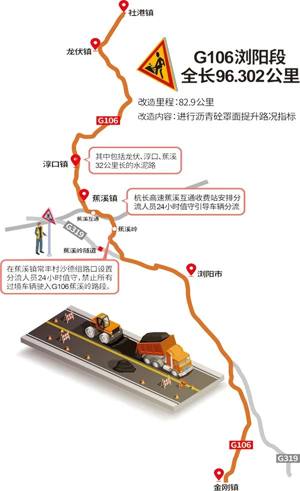 Yi Zhijian: In order to ensure the upgrading and reconstruction project to be carried out as scheduled, starting from October 19th, traffic restrictions will be taken in the construction section according to the Notice on Implementing Traffic Restriction Measures during the Construction of Upgrading and Reconstruction Project in Liuyang Section of G106 issued by the traffic police department. Before that, we also issued a traffic diversion notice, suggesting that the highway should be used as far as possible.