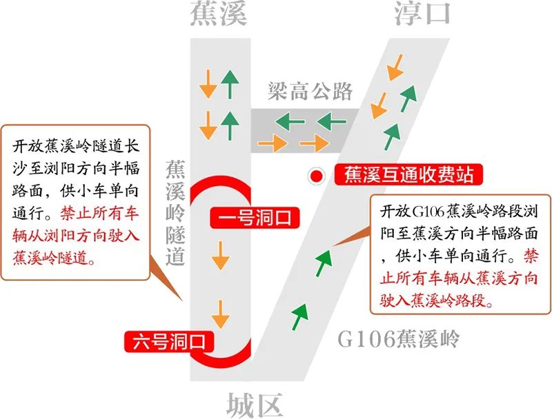 In addition, during the construction period, the construction of Jiaoxiling Tunnel, which was originally fully enclosed, was suspended. From 24: 00 on the 19th, half of the road surface of Jiaoxiling Tunnel from Changsha to Liuyang was opened for one-way traffic by cars, and all vehicles were prohibited from entering Jiaoxiling Tunnel from Liuyang. At the same time, half of the road surface from Liuyang to Jiaoxi on G106 Jiaoxiling section is opened for one-way traffic by cars. All vehicles are prohibited from entering Jiaoxiling section from Jiaoxi direction. That is to say, Jiaoxiling Tunnel and G106 Jiaoxiling Road Section form a one-way roundabout. Vehicles heading for Changsha in Liuyang can turn right at the entrance of Jiaoxiling Tunnel and enter G106 Jiaoxiling Road Section, and then turn to Lianggao Highway to enter G319 for Changsha. Vehicles heading for Liuyang from towns in the north area also need to turn to G319 through Lianggao Highway and enter Liuyang through Jiaoxiling Tunnel.